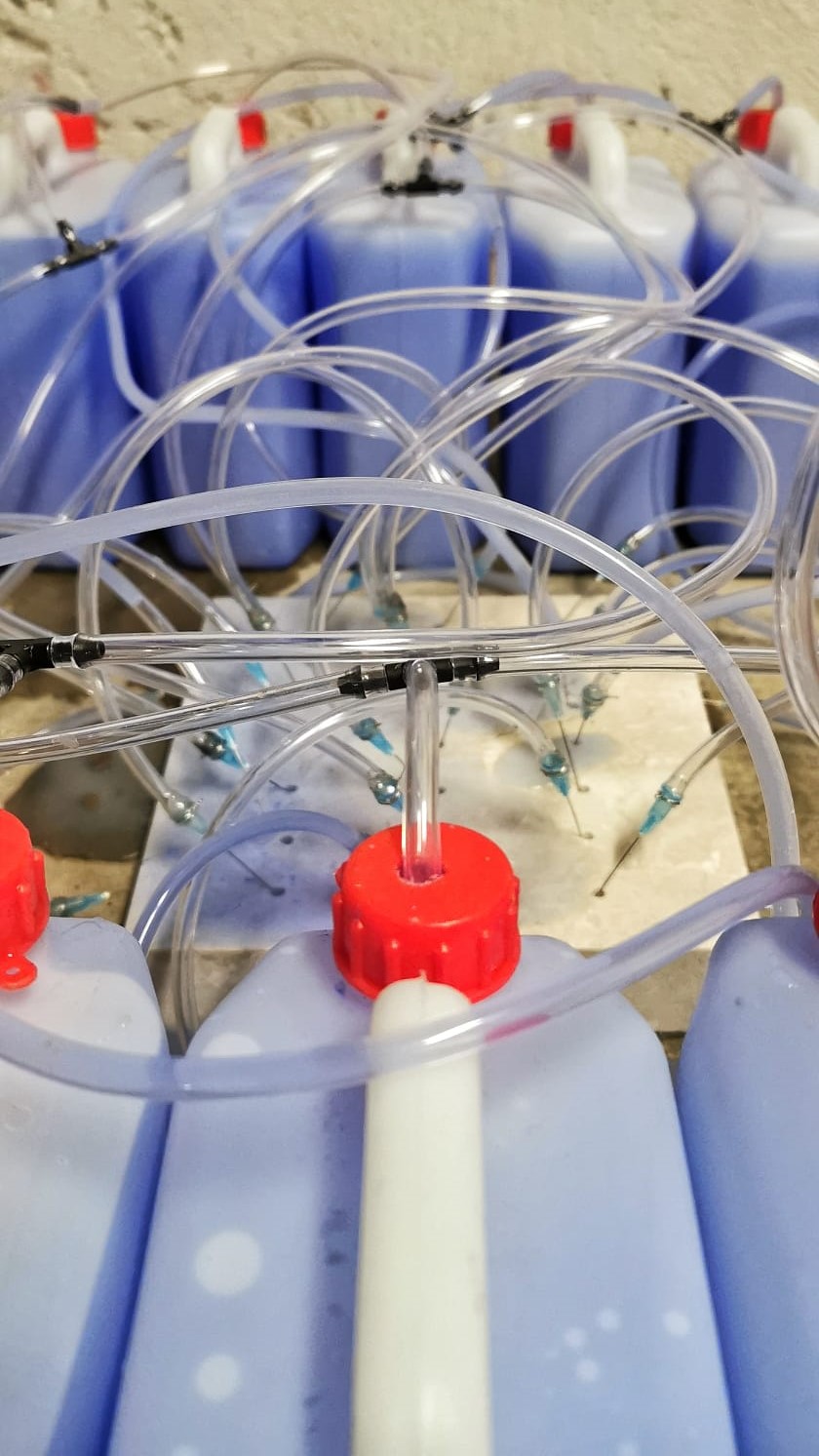 Varie installazioni dell’artista comunicano tra loro attraverso i liquidi.