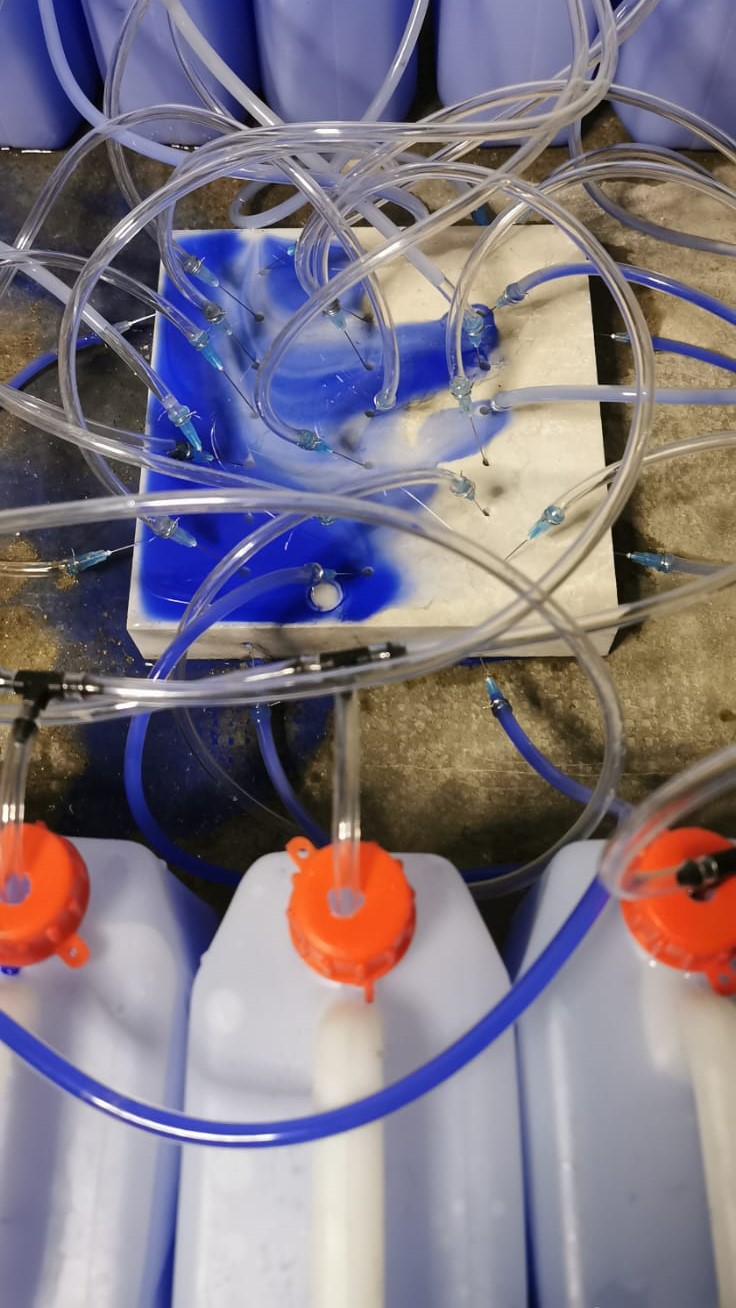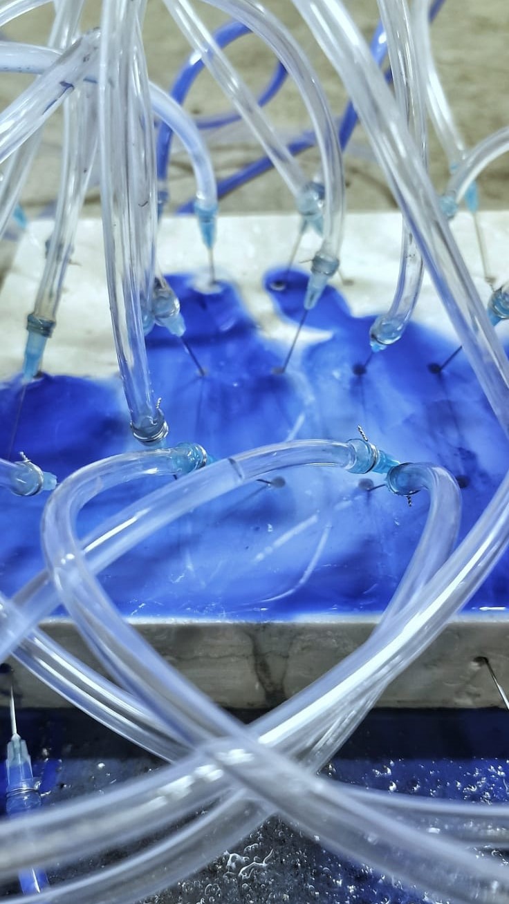 tubi pvc, plexiglass, pigmento, acqua, ferro e acciaio, pompa
